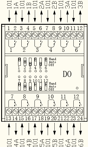 現(xiàn)場使用AC220V供電的三線制雙DO開關(guān)閥門,模塊上號(hào)碼管標(biāo)號(hào)為101的全部電線均為同相火線,作為公共端進(jìn)行使用,號(hào)碼管標(biāo)號(hào)為1A/1B、2A/2B之類的電線為閥門的信號(hào)線,規(guī)定A為雙DO開關(guān)閥的“打開”控制信號(hào),B為雙DO開關(guān)閥的“關(guān)閉”控制信號(hào)。在確認(rèn)控制模塊IO點(diǎn)的輸出狀態(tài)時(shí),發(fā)現(xiàn)無論軟件程序是否下發(fā)開啟指令,雙DO補(bǔ)水閥的A信號(hào)線與101火線均處于輸出狀態(tài),B信號(hào)線與101火線受程序控制,按照程序下發(fā)的指令分別執(zhí)行“打開”或“關(guān)閉”的動(dòng)作。為了再次判斷是閥門出現(xiàn)了故障,還是控制模塊出了問題,摘除101火線與A信號(hào)線,測量控制模塊的IO輸出點(diǎn),發(fā)現(xiàn)模塊控制101火線與A信號(hào)線的繼電器出現(xiàn)了“常閉”鎖死狀態(tài),更換了DO-FA-12-H模塊,問題暫時(shí)得到解決。