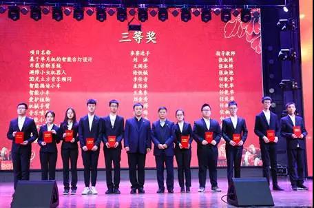 此次科技創(chuàng)新月活動經(jīng)過專家評審委員會評定共評選出三等獎139項、二等獎72項、一等獎30 項、特等獎2項?;顒舆^程中,由各位領導上臺為獲獎同學代表進行頒獎并合影留念。