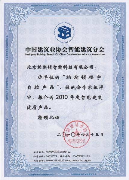2010年4月,我公司“柏斯頓樓宇自控產(chǎn)品“獲建設(shè)部“中國建筑業(yè)協(xié)會智能建筑分會”“2010年度智能建筑優(yōu)質(zhì)產(chǎn)品”證書;