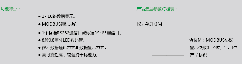 BS-401x協(xié)議顯示器是我公司針對沒有顯示器的控制系統(tǒng)應(yīng)用場合中的一種廉價(jià)顯示裝置,廣泛用于較小規(guī)模的PLC控制系統(tǒng)或電力變送器等,它采用FREESCALE最新8位高性能嵌入單片機(jī)技術(shù)設(shè)計(jì)的新型現(xiàn)場數(shù)據(jù)顯示設(shè)備。數(shù)據(jù)輸入僅以RS232或RS485通訊方式采集,數(shù)據(jù)顯示采用4位8段0.8英寸LED數(shù)碼管或3+1位8段(3個(gè)0.8英寸+1個(gè)0.6英寸)LED數(shù)碼管??娠@示1~10個(gè)數(shù)據(jù)。有兩種型號:BS-4010和BS-4011?,F(xiàn)場應(yīng)用可取代觸摸屏降低系統(tǒng)成本。