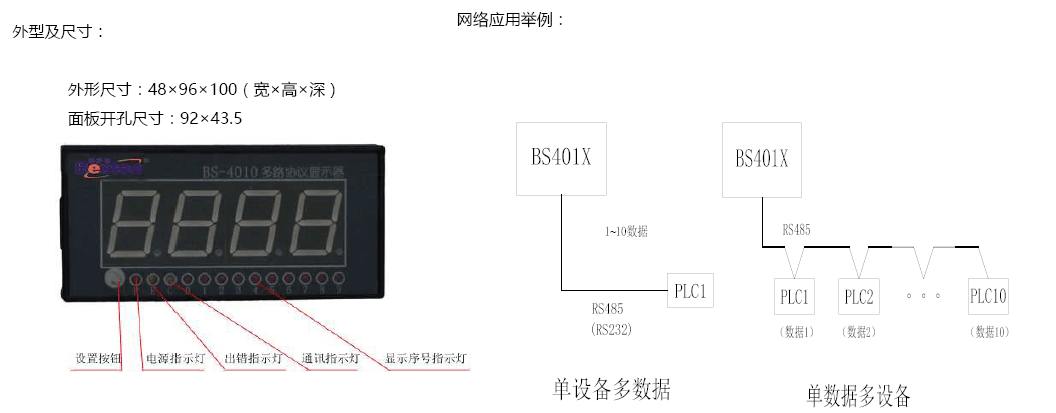 BS-4010:4位8段0.8英寸LED數(shù)碼管顯示數(shù)據(jù),以10個(gè)紅色LED小燈區(qū)別數(shù)據(jù)序號。