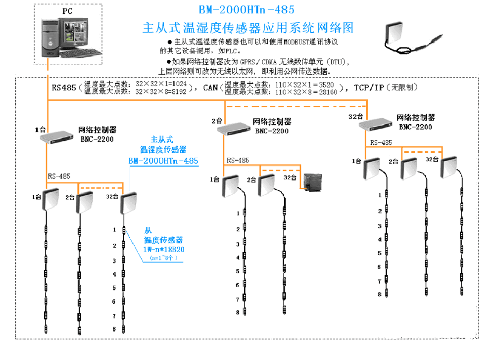 BM-2000HTD-485型主從式溫濕度傳感器是我公司針對(duì)樓宇自控特殊應(yīng)用場合研發(fā)的一種純數(shù)字式溫濕度傳感器,在主溫濕度傳感器的外部可自帶1~16只從溫度傳感器,主傳感器殼體內(nèi)置一個(gè)溫度傳感器和一個(gè)濕度傳感器,從傳感器通過一條專用電纜連接1~16只單總線數(shù)字式溫度傳感器,通過專用通訊協(xié)議將數(shù)據(jù)讀至主傳感器,主傳感器通過RS485通訊與上層設(shè)備通訊,通訊協(xié)議為MODBUS RTU。(無模擬量輸出) BM-2000HTD-485主從式型溫濕度傳感器采用8位高性能嵌入單片機(jī),適用于一臺(tái)空調(diào)機(jī)組范圍內(nèi)